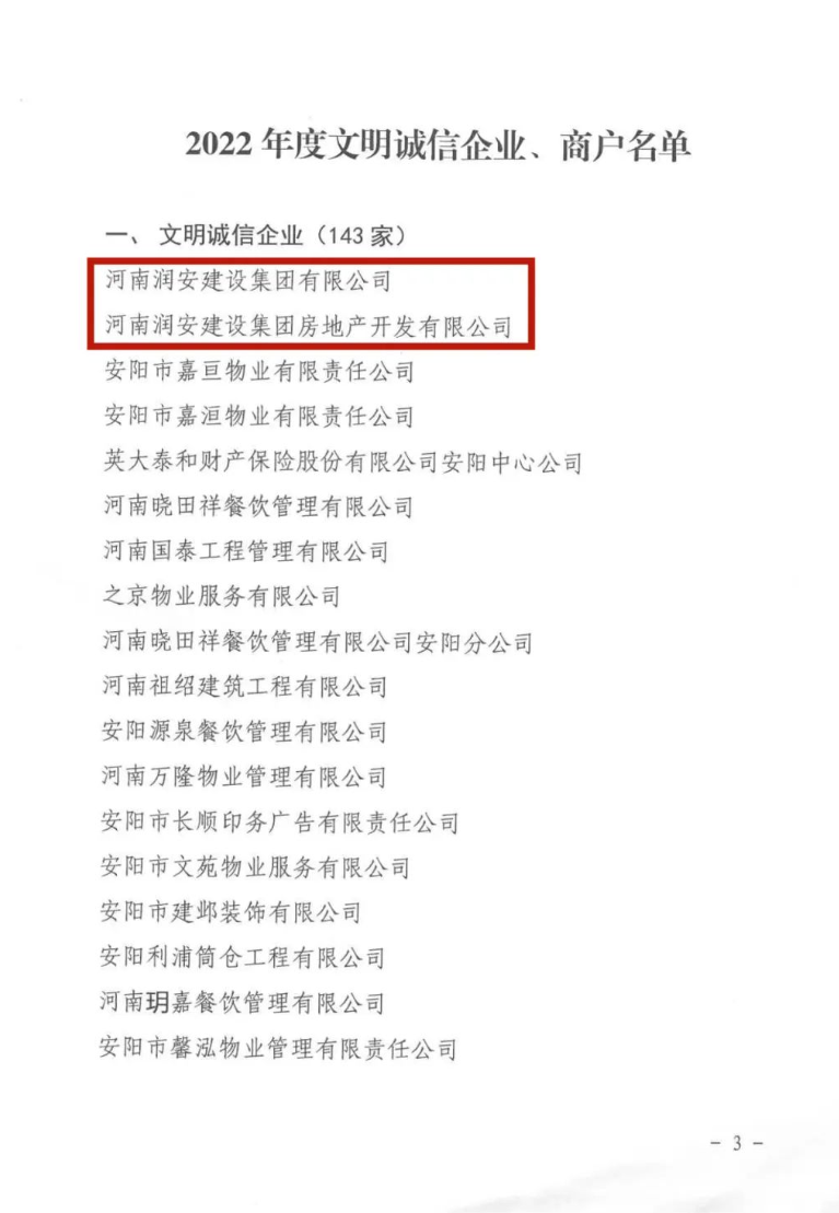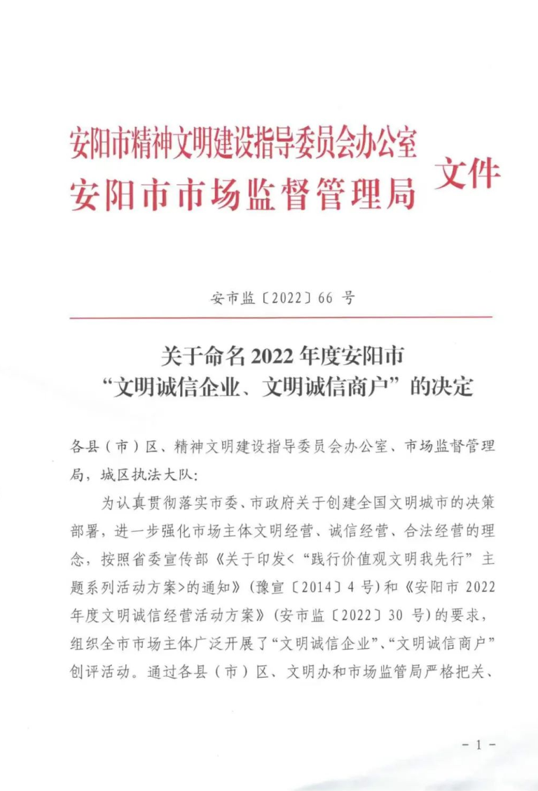 文件指出:為認(rèn)真貫徹落實(shí)市委、市政府關(guān)于創(chuàng)建全國文明城市的決策部署,進(jìn)一步強(qiáng)化市場主體文明經(jīng)營、誠信經(jīng)營、合法經(jīng)營的理念,組織全市市場主體廣泛開展了“文明誠信企業(yè)”、“文明誠信商戶”創(chuàng)評活動。通過各縣(市)、區(qū)文明辦和市場監(jiān)管局嚴(yán)格把關(guān)、逐級推薦,經(jīng)市文明辦、市市場監(jiān)管局研究,對在2022年度文明誠信經(jīng)營活動中成績突出的河南潤安建設(shè)集團(tuán)有限公司等143家企業(yè)予以命名。具體文件如下: 潤安集團(tuán)長期以來高度重視企業(yè)信用管理,堅(jiān)持誠信經(jīng)營,傾力打造“潤安”品牌。此次獲評文明誠信企業(yè),充分說明了潤安集團(tuán)在企業(yè)信譽(yù)、品牌建設(shè)方面得到了社會的高度認(rèn)可,也必將成為公司高質(zhì)量發(fā)展的強(qiáng)大推動力。 下步,潤安集團(tuán)將以此次表彰為契機(jī),以習(xí)近平新時代中國特色社會主義思想和黨的二十大精神為指引,時刻保持依法經(jīng)營、誠信納稅的理念,積極發(fā)揮正面典型示范,樹立文明誠信的良好形象,堅(jiān)持誠信立身、誠信創(chuàng)業(yè),為安陽經(jīng)濟(jì)社會發(fā)展?fàn)I造良好的市場環(huán)境,為創(chuàng)建文明城市助力加油,作出貢獻(xiàn)。